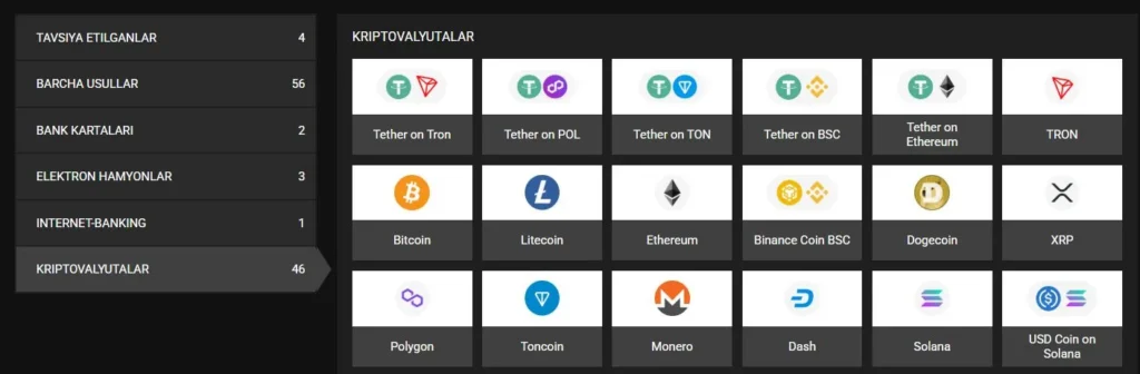 Упоминаются HUMO и UZCARD. Также встречаются: банковские карты (Visa/Mastercard), электронные кошельки (Skrill, Neteller, Perfect Money, WebMoney и др.), криптовалюты. |